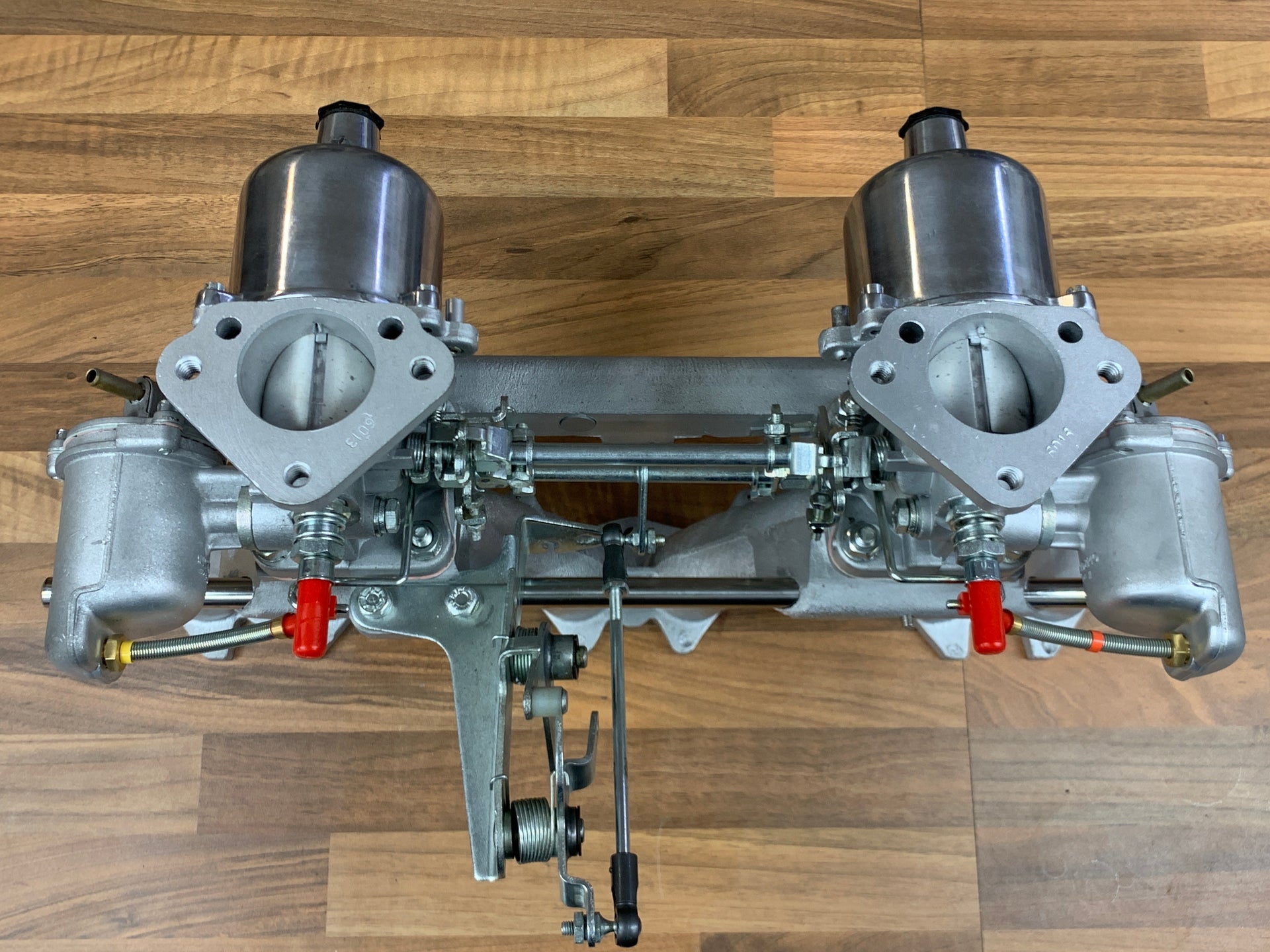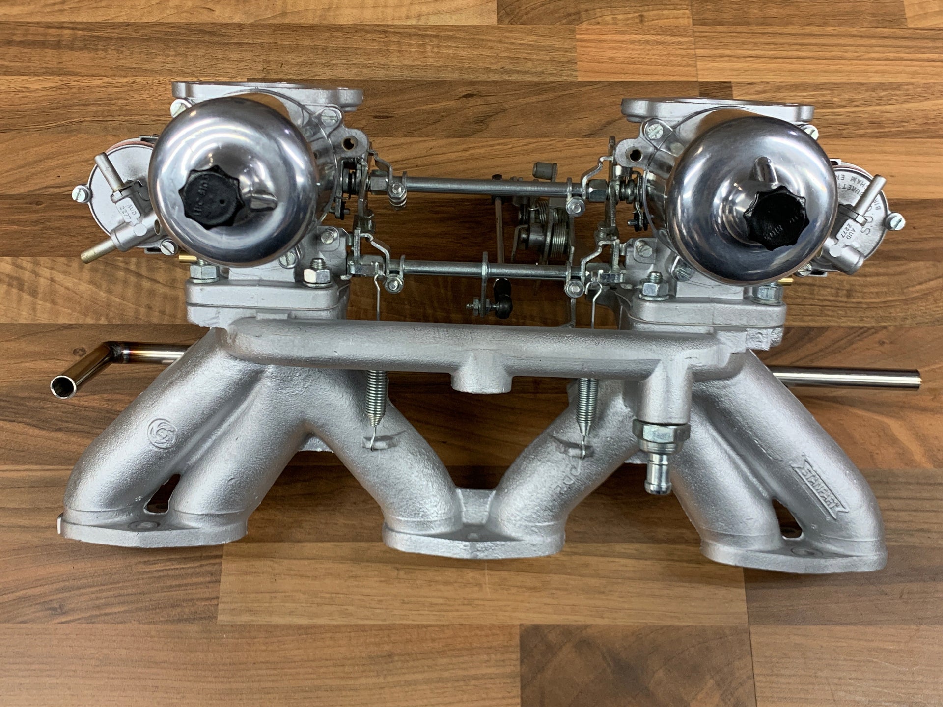 PAIR OF 1-3/4" SU CARBURETTORS MOUNTED ONTO A SALOON MANIFOLD.